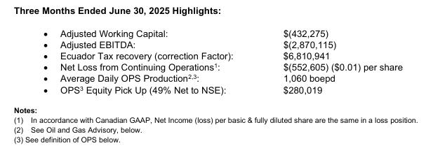 For the six months ended June 30,2025, Operaciones Petroleras Soledad S. de R.L. de C.V (“OPS”), the Operator, reported net income of US$1,127,224 of which US$ 778,468 is attributable to the NSE 49% equity interest.